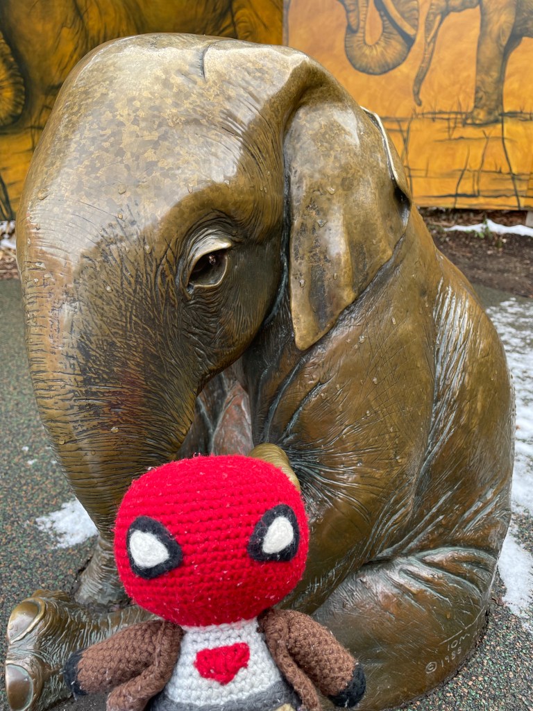 Here is Little Red posing with a cute statue of a baby elephant. This was taken in front of the Elephant Enclosure. I love that you can see where people like to pet the statue from where it is shinier.