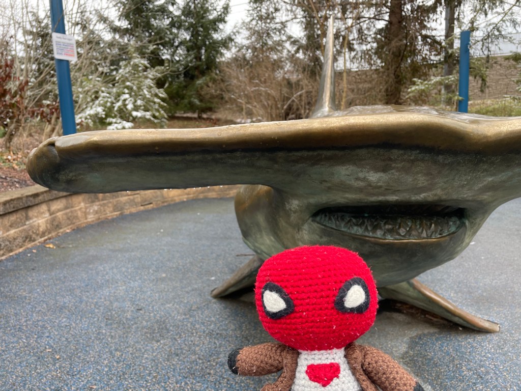 What big teeth you have! Little Red is thinking as he poses with this Hammerhead Shark statue. (This statue is my personal favourite in the whole Zoo.)